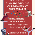 We’re bringing the excitement of the Olympic Winter Games in Milano Cortina 2026 to the Brandon Public Library with an Opening Ceremony Watch Party! Drinks and snacks will be provided. Bring your friends. Friday, February 6th from 12:30 to 4 PM. No fee to attend, and no registration necessary.