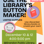 11dec4:00 pm5:30 pmFibre Crafts4:00 pm - 5:30 pm Brandon Public Library